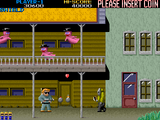 In this ghostly quest, players can upgrade their weapons to fire lasers, bombs, or a spread shot, adding strategic depth to the gameplay. Collectible items, such as shields and heart icons, offer additional layers of engagement, encouraging players to explore each stage thoroughly.