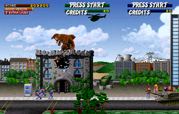 The game’s storyline is straightforward yet engaging. An explosion at a Scumlabs facility releases George, Lizzie, and Ralph, three giant monsters who embark on a mission to destroy Scumlabs’ bases worldwide. The game culminates in a showdown on a lunar base against the villainous CEO Eustace DeMonic, who attempts to stop the monsters by transforming into one himself. The plot’s humor and simplicity are a perfect backdrop for the destruction that ensues.